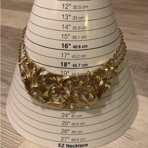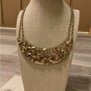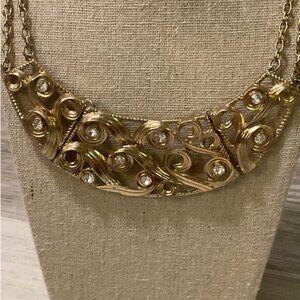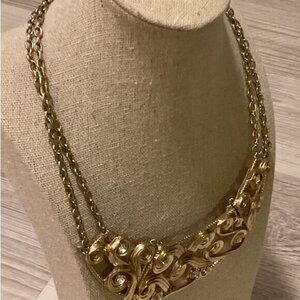 Elegant gold-tone necklace with clear rhinestones in a scrolling filigree design. Features a double chain and bib style that adds a touch of sophistication to any outfit. Perfect for special occasions or everyday wear.