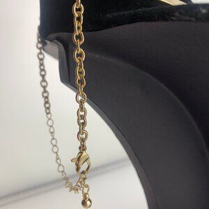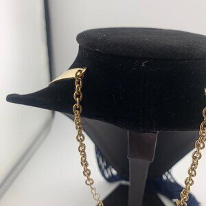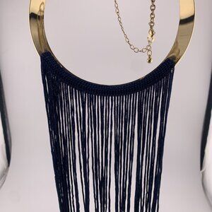 This piece features a thick, polished gold-tone band that sits elegantly at the base of the neck, and it's adorned with a dramatic cascade of deep navy blue fringe. The fringe measures approximately 9 inches, creating a beautiful waterfall effect. The back features a secure lobster clasp and an adjustable extender chain for a perfect fit. This necklace is new without tags and is ready to be the centerpiece of your next outfit.