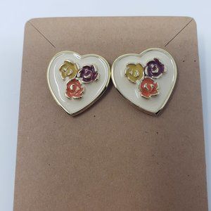 Gold tone cream enamel heart shape earring with flower cluster details, yellow orange and red, stud post pierced.
