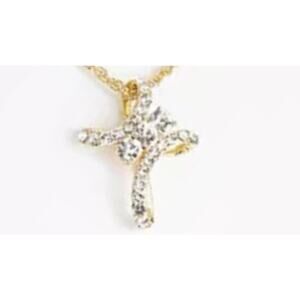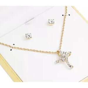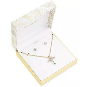 Gold Tone Cross Necklace Earrings (2 Piece Set) Crystal Pendant Studs Chic NWT