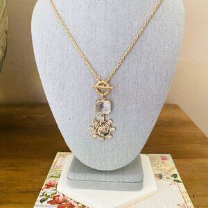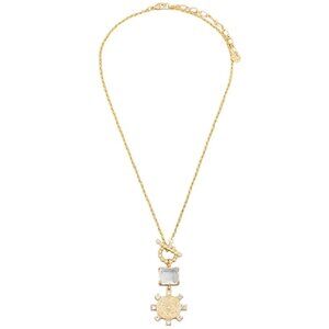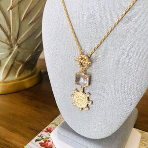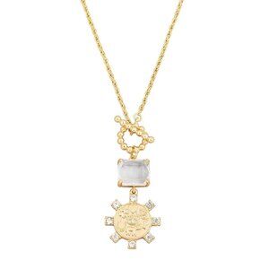Gold tone front toggle necklace with one large faceted clear crystal above the coin pendant. Small crystals surround the coin pendant.