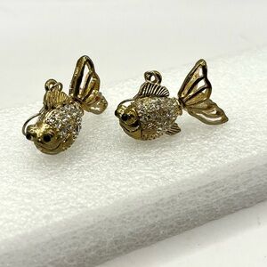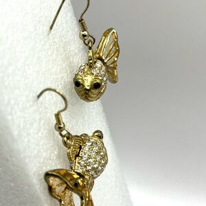 Gold Tone Crystal Fish Earrings with Whimsical Design 3 D Hook Earrings