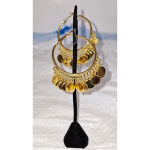 These are a gorgeous bright gold colored hoop with discs hanging from the bottom. They are very harem like in style. The hoops are 1.5" in diameter. They have enough class to go with your finest formal dress, and enough sass to wear for more casual events. They are in nice pre-owned condition.