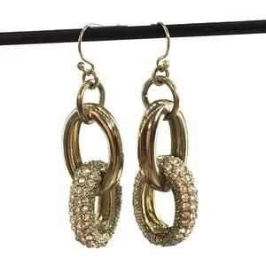 These vintage-inspired dangling earrings showcase a timeless elegance with their gold-tone double hoop design, embellished with sparkling rhinestones. A classic accessory that adds a touch of sophistication to any attire, echoing the charm and allure of bygone eras.