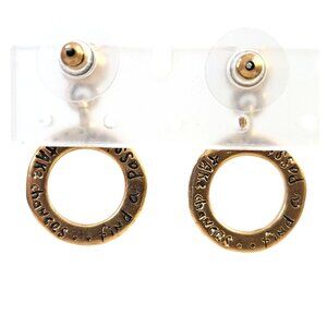 Gold Tone Drop Earrings W/ Clear Crystal Studs & Text Engraved Open Circle