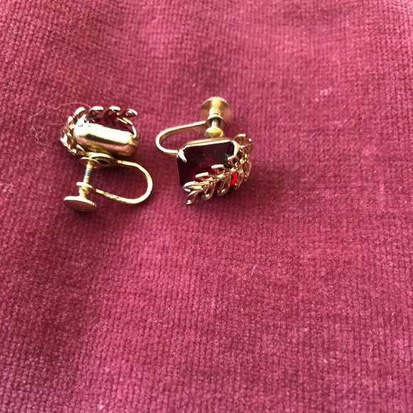 Gold Tone Earrings with Red Stone, Screw Clasp, Gold Tone Leaf on top of Stone, Excellent Condition