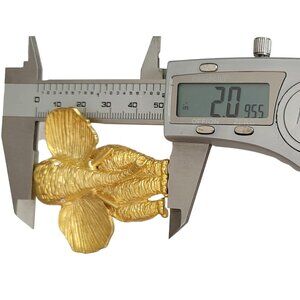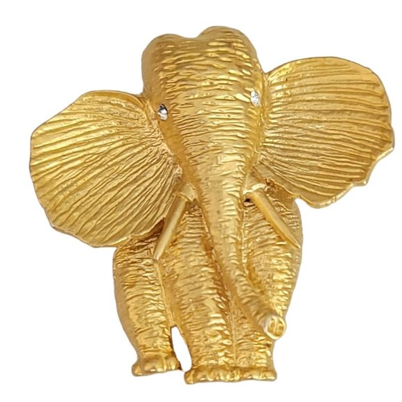 You will appreciate the very chic style of this Elephant Brooch that can provide versatility to your look. It features a gold-tone base metal elephant figure with intricate detailing of an elephant's physical characteristics. The textured pattern depicts the wrinkled skin, adorned with clear rhinestones for the eyes. This delightful pin measures approximately 2 inches at its widest and 2 inches in length. The back has a secure locking pin that is easy to fix on the back and can be firmly attached to your clothing.