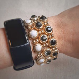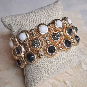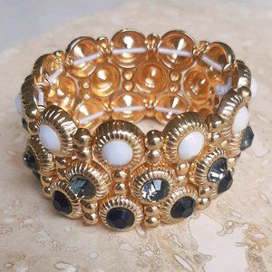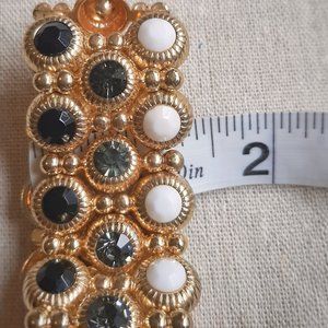 Gold Tone Faceted Gem Stretchy Statement Bracelet. Beautiful unmarked gold tone metal bracelet with faceted white, black and gray blue rhinestones. The white and black ones feel plastic. Very good preowned condition. Measurements are approximate.