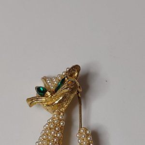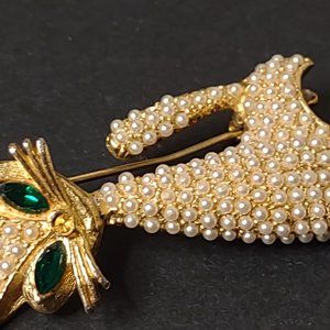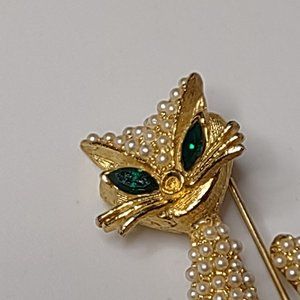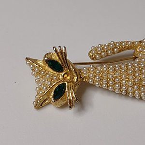 Gold Tone Faux Pearl Cat Brooch With Green Eyes