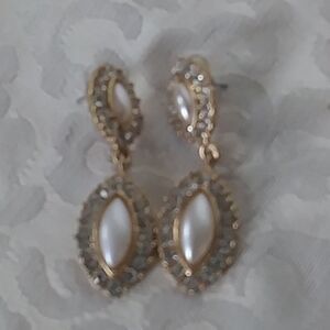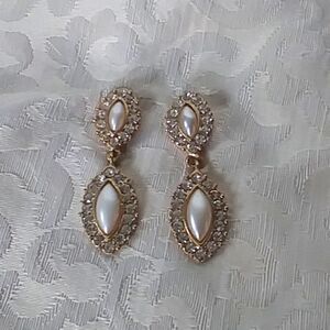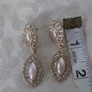 Classic and elegant upscale costume jewelry. These earrings are from the mid 90s and were purchased at a department store...which store I don't know. They are gold toned with rhinestones and pearlized faux gems. There are earlobe stabilizers on the earring backs. The gold tone is