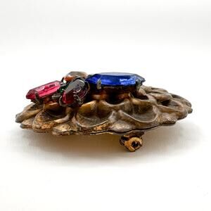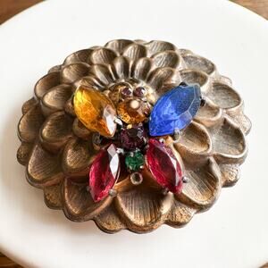 This stunning Czech 3d pin is a brass tone filigree flower. Set in the flower are multi colored stones making up a butterfly. The stones are vibrant colors of blue, yellow, ruby red, and emerald green.