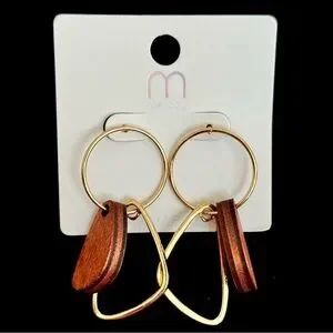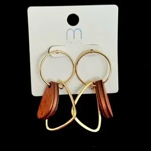 Gold Tone Geometric Dangle Earrings w/ Orange Wood Accents