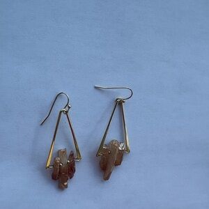 Gold Tone Geometric Earrings with genuine quartz stones fish hook back