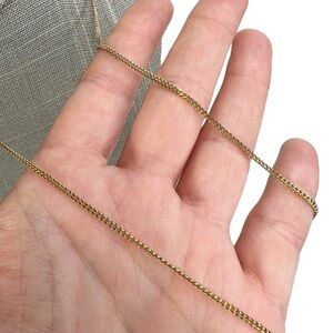Gold Tone Geometric V Open Circle Long Chain Necklace. In gently preowned condition. No brands or markings. Geometric open circle with a V cut out (kind of reminds me of Pac-Man). 2 light gray round faux stones that register as glass inside the V. Cable chain with lobster closure and extender.