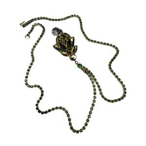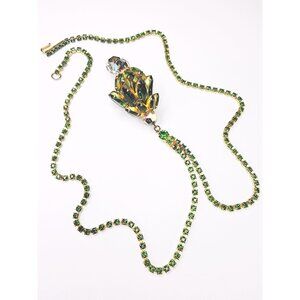 Gold Tone Green Rhinestone Chain Necklace With Rhinestone Pendant – 24” Long