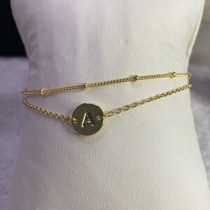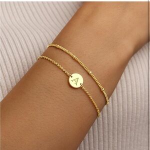 Elegant gold tone bracelet featuring a personalized initial charm. Perfect for adding a touch of sophistication to any outfit.