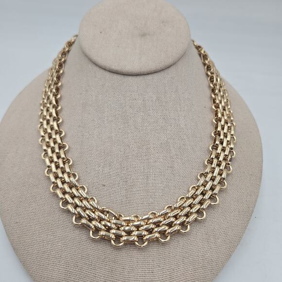 Gold Tone Interlocking Woven Weave Necklace Heavy Chain Metal Chic Choker 18"