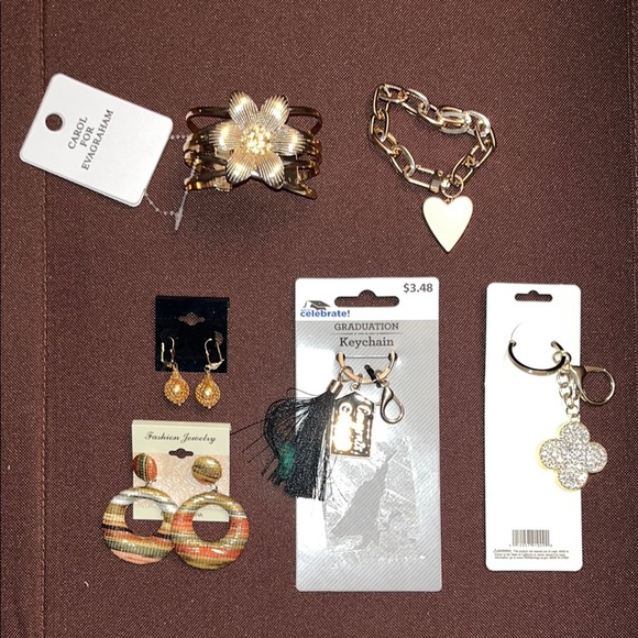 Elegant gold and silver jewelry set featuring bracelets, earrings, and keychains. Perfect for accessorizing any outfit.