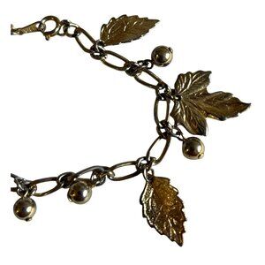 Add a touch of elegance to your ensemble with this exquisite gold tone leaf and ball charm bracelet. Delicately crafted, it offers a unique blend of nature-inspired design and chic sophistication, making it a versatile addition to any jewelry collection. In very good condition.