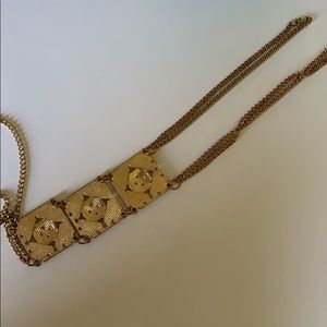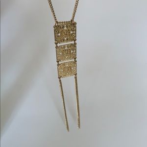 Long gold-tone metal necklace with square medallions and chain tassels.