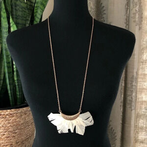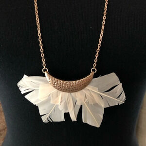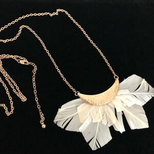 Gold Tone Long Chain Cream Feather Necklace Hammered Boho Fashion Jewelry 32”