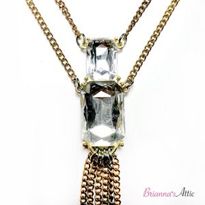 Gold Tone Long Square Crystal Necklace with Artistic Earrings