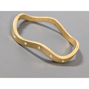 This elegant gold tone matte tennis bracelet features wavy rhinestones for a dazzling look. Perfect for adding a touch of glamour to any outfit. Ideal for special occasions or everyday wear.