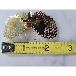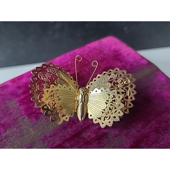 This is a vintage gold tone metal filigree butterfly shaped brooch.