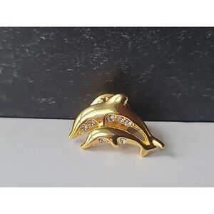 This is a vintage gold tone metal two dolphins shaped pin with clear rhinestones on the bodies.