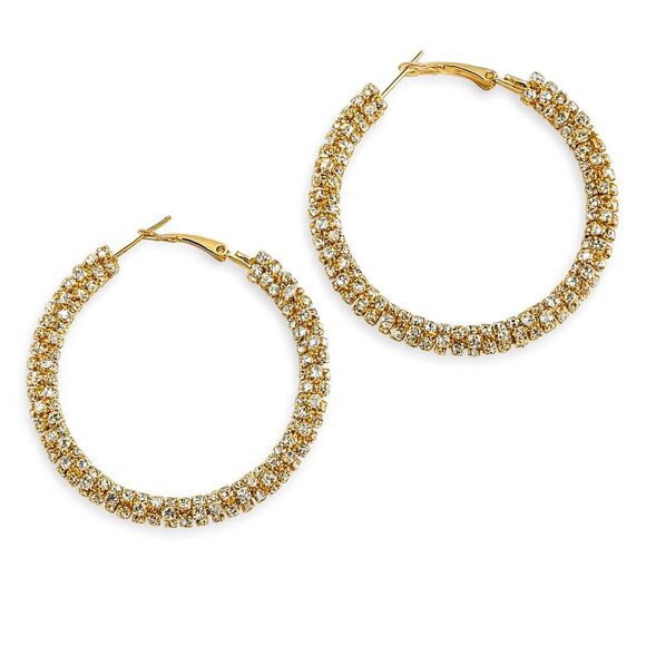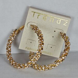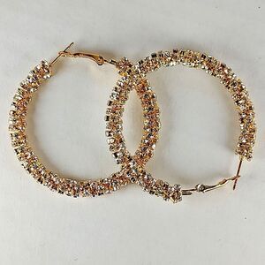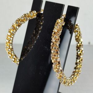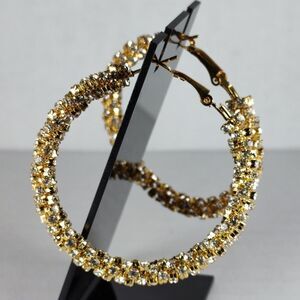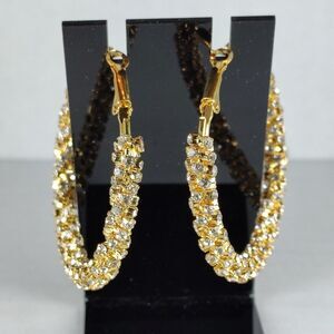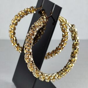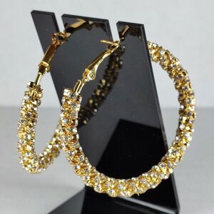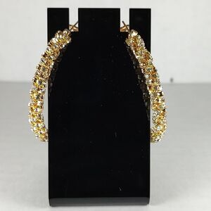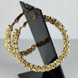 Gold Tone Metal White Colorless Rhinestones Hoop Statement Fashion Earrings