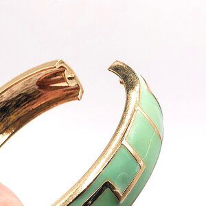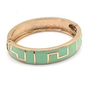 Add a pop of color and vintage flair with this gold tone mint green enamel bangle bracelet. The hinged design makes it easy to wear, while the geometric pattern gives it a modern, designer-inspired look.