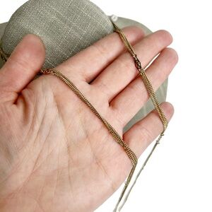 Gold Tone Multi Strand Gray Rhinestone Twisted Dangle Pendant Necklace. In gently preowned condition: there was one rhinestone that I had to reglue (see circled pic). 3 gold tone chains with Diamond shaped filigree stations. Round twisted pendant with gray rhinestones. Small teardrop dangle below the pendant. Unbranded. No precious metal or stones.