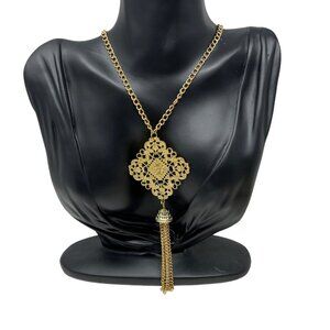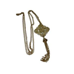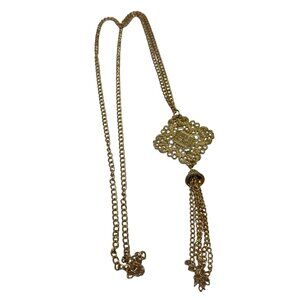 Gold Tone Necklace Long Chain Trangular Pendant with Tassel