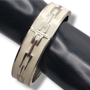 Gold Tone Off White Cream Enamel Art Deco Vintage Hinged Bangle Bracelet