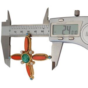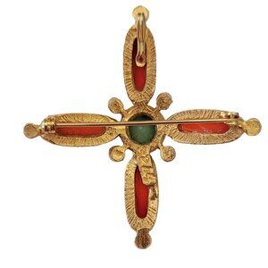 Add a touch of elegance to any outfit with this Gold Tone Maltese Cross, showcasing excellent workmanship, exquisitely made with utmost attention to every detail. It features a gold-tone Maltese Cross figure intricately designed with bezel set orange and green mottled cabs at the center accented with clear rhinestones. It measures 2.4 inches in length. The back is marked with number 3244 and could be a Sphinx piece, it has a secure locking pin that functions properly and a bale for your favorite chain necklace. This versatile piece is perfect for collectors or those looking for a unique accessory to complement their style, this brooch is sure to catch the eye.