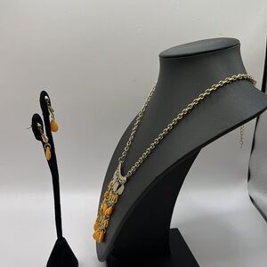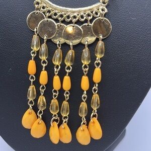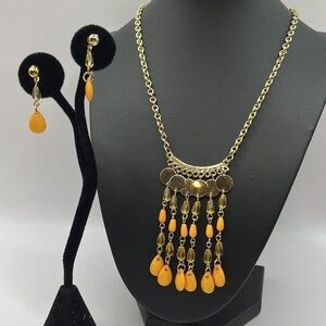 Gold Tone Orange Egyptian Style Necklace Set Bezeled Teardrop Beads and Yellow
