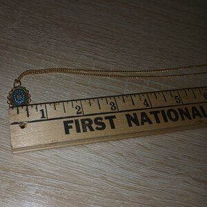 Gold Tone Oval Blue Patterned Pendant Necklace Vintage Costume Jewelry #101