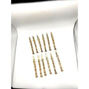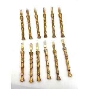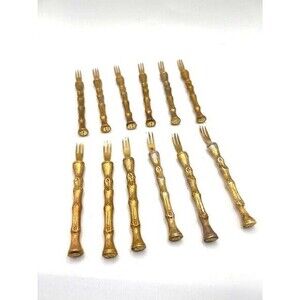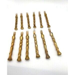 Gold Tone Oyster Shrimp Trident Tip Cocktail Forks Set of 4 Bamboo Design
