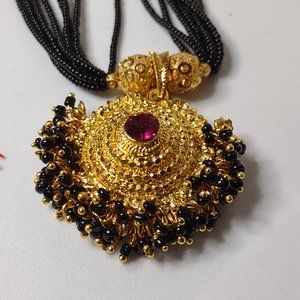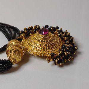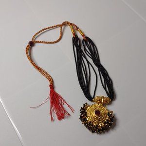 Gold Tone Pendant And Small Black Bead Adjustable Necklace