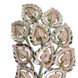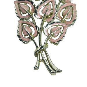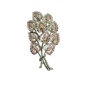 Gold Tone & Pink Enamel Bouquet Brooch W/ Matching Clip On Earrings Set (5750)