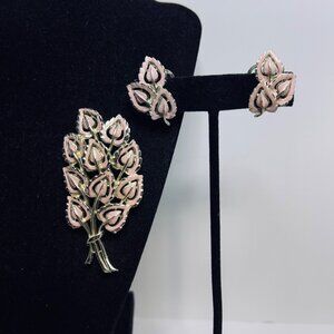 This vintage jewelry set includes a brooch and clip-on earrings, featuring a delicate pink enamel floral design with gold-tone accents. A timeless accessory for elegant styling.