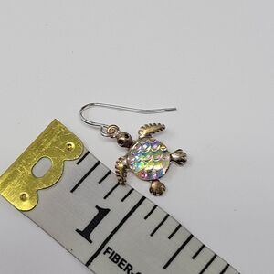 Elegant gold tone earrings featuring intricately carved sea turtles. The iridescent enamel detailing adds a touch of sparkle, making these drop earrings a perfect choice for nautical or sea-life themed accessories.