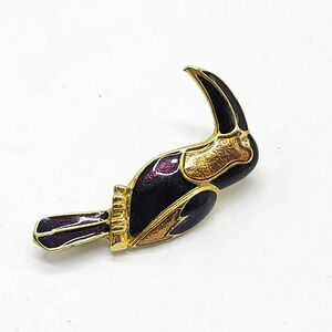 • Gold Tone Purple and Gold Enamel With Rhinestone Eye Toucan Brooch Pin Vintage 2.25" x 1.5"