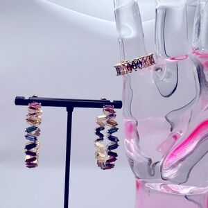 Gold Tone Rainbow Rhinestone RIng and C hoop pierced earrings