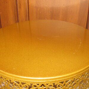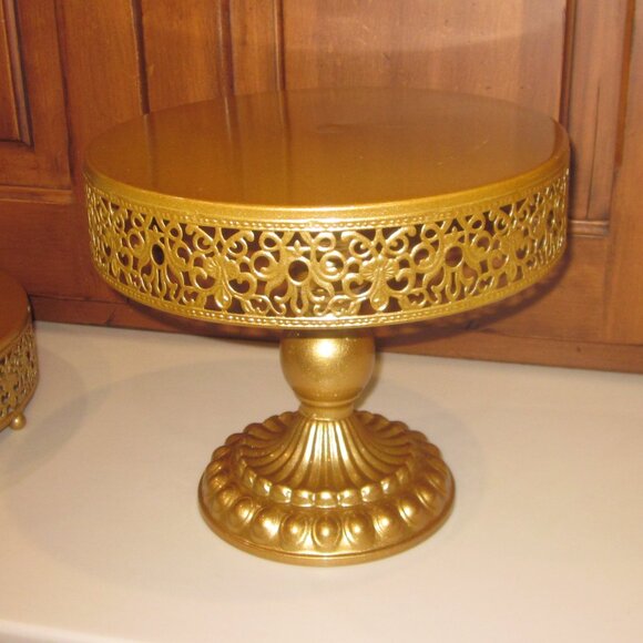 plate does have a few scratches, gold tone metal raised cake stand, 9.5" across, 8.5" tall, plate does come off for storage, matches others in closet