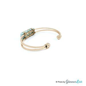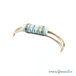 Minimalist gold tone cuff bracelet featuring a rectangular light blue wire wrapped stone.