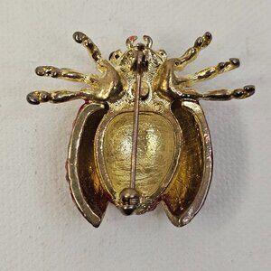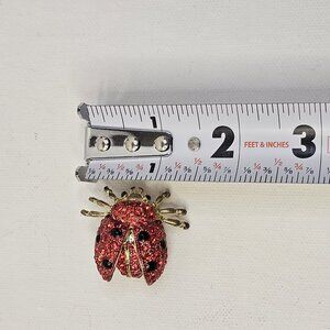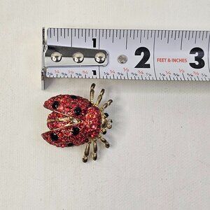 Gold Tone Red Crystal Ladybug Brooch Green Rhinestone Eyes Unmarked Pin