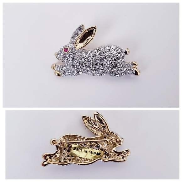 Gold Tone Rhinestone Running Rabbit Brooch