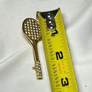 Gold Tone Rhinestone Tennis Racket Brooch Pin Sparkly Sports Jewelry Gift