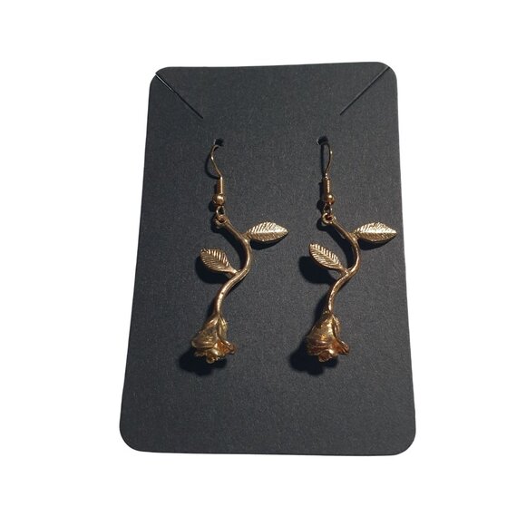 Gold Tone Rose Dangling Earrings Leaf Hook Backings Lightweight Jewelry Mom Gift